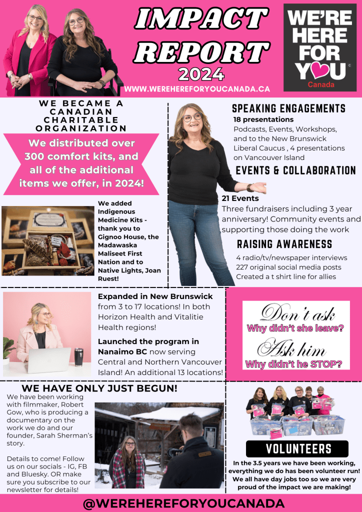 Established in December 2021, our initiative was born out of a deep-seated commitment to support survivors of sexual violence in the province of New Brunswick. Initially focused on providing comfort kits and fresh clothing to individuals leaving hospital emergency rooms, we quickly realized the widespread need for such support across the hospital system. We currently serve two province, NB and BC and plan to expand further this year. All work is always free and we are volunteers who work closely with Sexual Assault Nurse Examiners (SANE) also known as Forensic Nurse Examiners (FNE). WHFYC became a registered federal nonprofit on January 11, 2024 and a Canadian charity on April 11, 2024. .